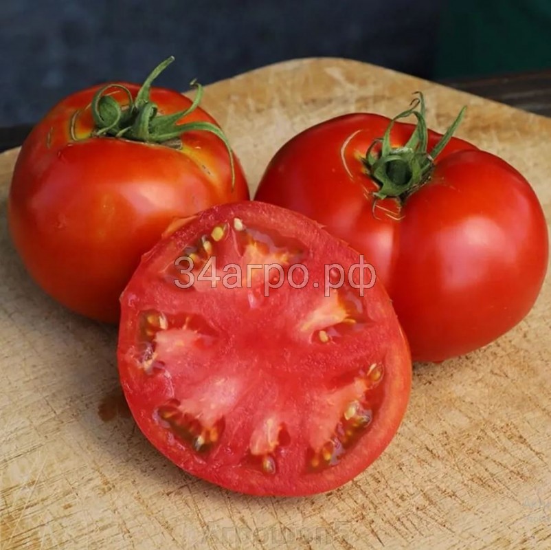 Плоды: округлая форма, немного сплюснутая у плодоножки. Вес — 150-200 г. Цвет зрелых томатов — красный или малиново-красный, недозревшие плоды — светло-зелёные. Кожица гладкая и плотная, не позволяет овощу растрескаться. Мякоть сочная, мясистая, немного плотная и немного водянистая. Внутри формируется много мелких камер, семян в них мало.